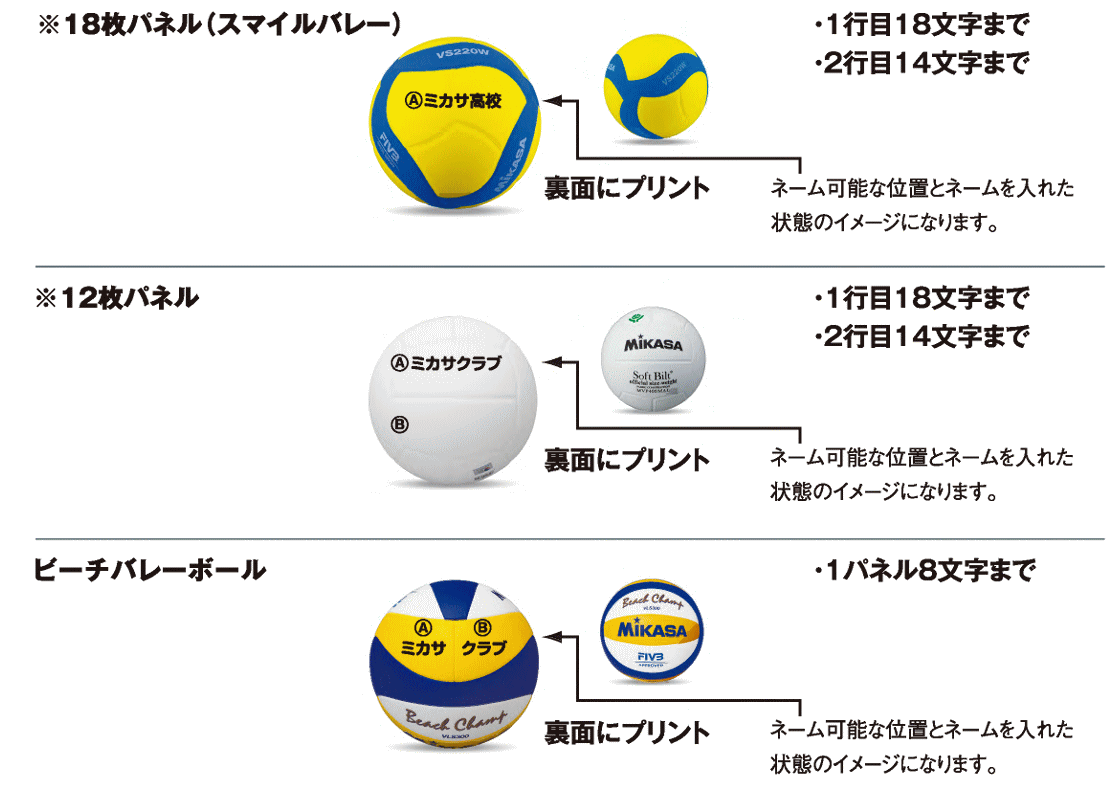 ミカサ/バレーボールネーム加工 【学校・チーム名432円/個】【個人名1,296円/個】 ●書体:丸ゴシック体・角ゴシック体・明朝体・楷書体 ●ネームカラー:黒・赤 ●18枚パネル ・文字位置:A ・文字数: 1行なら18文字まで 2行なら各行14文字まで ●8枚パネル ・文字位置:A ・文字数: 1行なら18文字まで 2行なら各行14文字まで ●12枚パネル ・文字位置:A・B ・文字数: 1行なら18文字まで 2行なら各行14文字まで ●ビーチバレーボール ・文字位置:A ・文字数: 1行なら18文字まで 2行なら各行14文字まで (チーム名はご購入の際の備考欄にご記入ください。